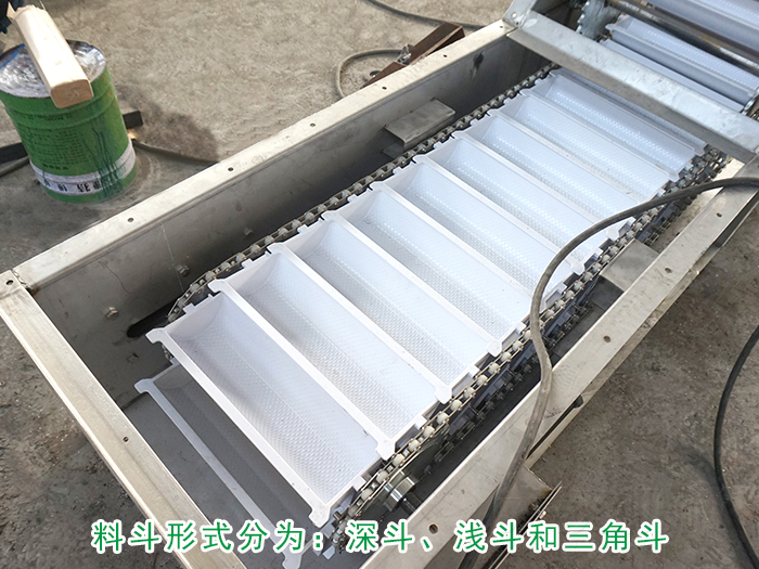 三角形料斗:深斗是具有導(dǎo)向側(cè)邊的三角形料斗,這種料斗在提升機(jī)中采用一個(gè)接一個(gè)的密集布置,當(dāng)繞過上鏈輪卸料時(shí),前一個(gè)料斗的兩導(dǎo)向側(cè)邊和前壁形成后一個(gè)料斗的卸載導(dǎo)槽,這種料斗適于輸送較重的、半磨琢性的、磨琢性大的塊狀物料。