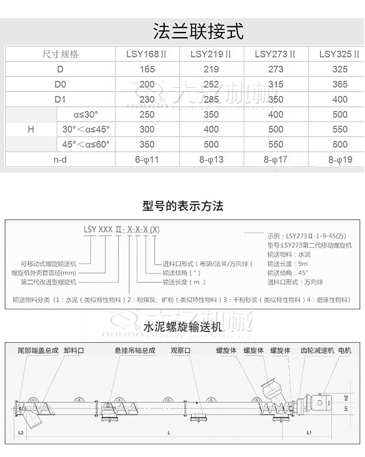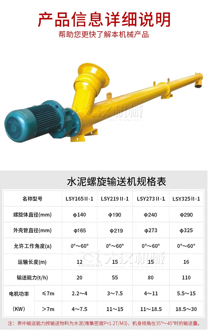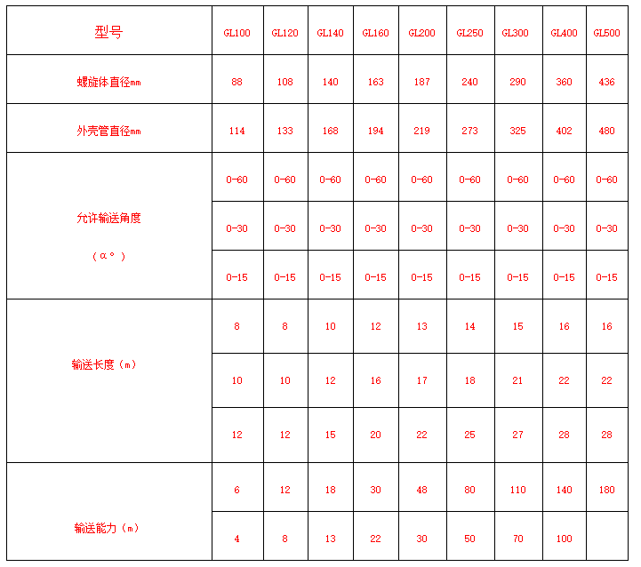管式螺旋輸送機適用于水平或傾斜輸送粉狀、粒狀和小塊狀物料,如煤、灰、渣、水泥、糧食等,物料溫度小于200℃,不適宜輸送易變質(zhì)的、黏性大的、易結塊的物料。參數(shù)如下: