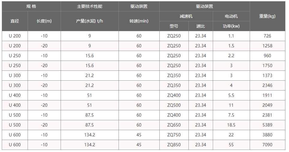 U型螺旋輸送機工作時,電機帶動旋轉的螺旋葉片將物料推移而進行輸送,螺旋輸送機旋轉軸上焊的螺旋葉片,葉片的面型根據(jù)輸送物料的不同有實體面型、帶式面型、葉片面型等型式。使物料不與螺旋輸送機葉片一起旋轉的力是物料自身重量和螺旋輸送機機殼對物料的摩擦阻力。參數(shù)如下: