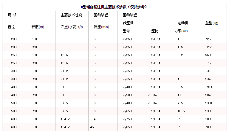 U型螺旋輸送機主要技術參數(shù)(僅供參考)