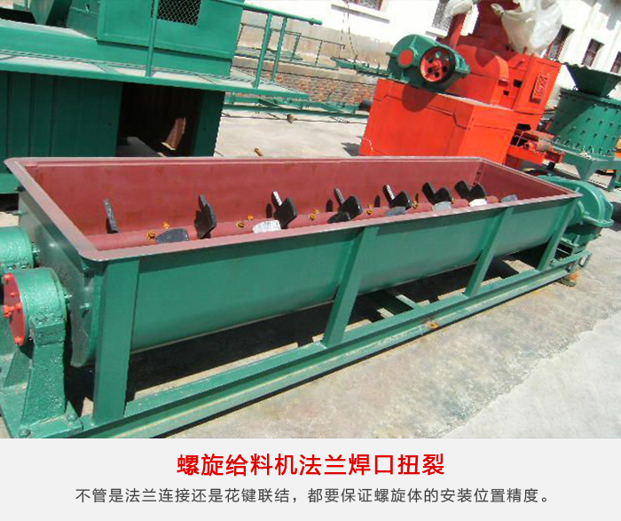 1、由于異常扭矩的產(chǎn)生,聯(lián)結(jié)法蘭焊接失效,處理方法是保證設(shè)備安裝精度,不管是法蘭連接還是花鍵聯(lián)結(jié),都要保證螺旋體的安裝位置精度,安裝后應(yīng)接線調(diào)試確定螺旋轉(zhuǎn)向,聲音有無(wú)異常。試運(yùn)轉(zhuǎn)后檢查電機(jī)、減速機(jī)、軸承溫升,一切正常后,開動(dòng)手動(dòng)螺旋料倉(cāng)閘門逐漸加料,經(jīng)過(guò)調(diào)試后,使螺旋運(yùn)轉(zhuǎn)平穩(wěn)。