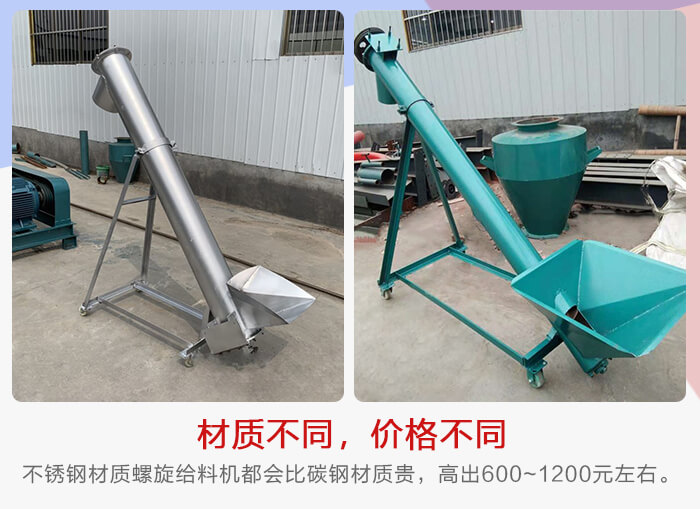 螺旋給料機可以分為碳鋼和不銹鋼材質(zhì)兩種,由于這兩者材質(zhì)成本有差異,碳鋼螺旋給料機適合普通物料輸送,不銹鋼螺旋給料機主要用于輸送機一些腐蝕性、高溫物料,也用于食品、醫(yī)藥等對輸送環(huán)境有衛(wèi)生標(biāo)準的行業(yè),所以不銹鋼材質(zhì)螺旋給料機都會比碳鋼材質(zhì)貴,一般會高出600~1200元左右。