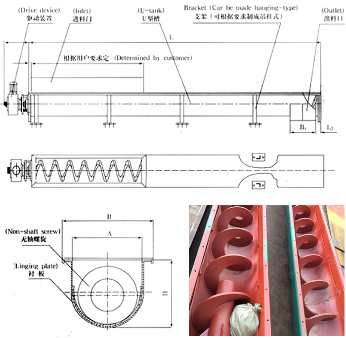 無軸螺旋絞龍輸送機(jī)由無軸螺旋、U型槽、襯板、蓋板、進(jìn)出口和驅(qū)動裝置組成。