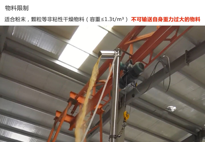 垂直螺旋輸送機(jī)只用于輸送粉末或固體顆粒等非粘性干燥物料(容重≤1.3t/m³),因?yàn)槠洳捎孟蛏陷斔?,在輸送過程中物料自身重力如果過重,會造成輸送難以進(jìn)行。