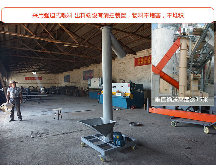 大漢垂直立式螺旋輸送機(jī)采用的是強(qiáng)迫式喂料,在出料端安裝有清掃裝置,輸送中物料不堵塞,不堆積;采用垂直(90°)或大傾角輸送,節(jié)省占地面積,垂直輸送高度可達(dá)15米,可根據(jù)需求選擇。
