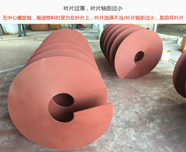 葉片軸距過小:螺旋槽體選擇不當,輸送物料的時葉片軸距過小,會造成擠壓力過大,損傷葉片;若槽體較小,同樣也會造成壓力過大,導(dǎo)致葉片損害。