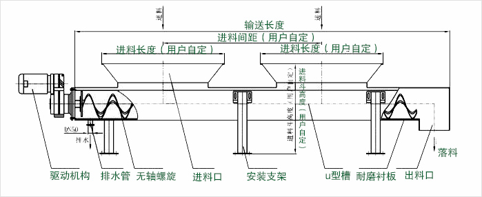 以上是對水平螺旋輸送機結(jié)構(gòu)及工作原理的介紹,水平螺旋輸送機有:200、250、300、400、500、600等型號,用于粉狀/顆粒狀/小塊狀物料的小型、短距離輸送,可根據(jù)要求選擇單點加料、單點卸料、多點加料、多點卸料。