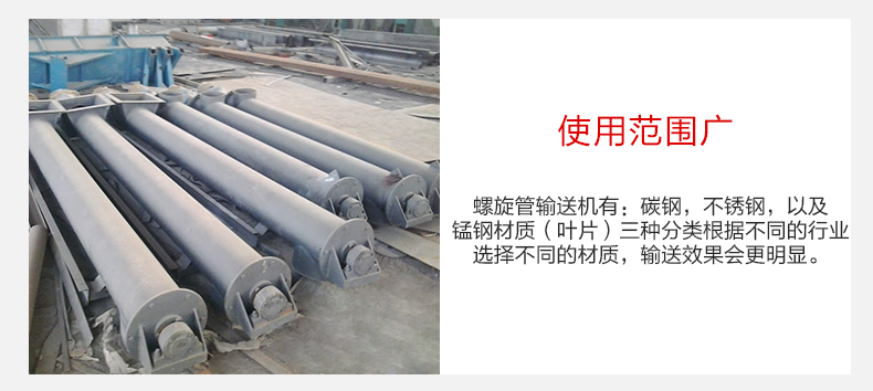 3,產(chǎn)品材質(zhì)可供多個行業(yè)進(jìn)行選擇,螺旋管輸送機有:碳鋼,不銹鋼,以及錳鋼材質(zhì)(葉片)三種分類根據(jù)不同的行業(yè)選擇不同的材質(zhì),輸送效果會更明顯。
