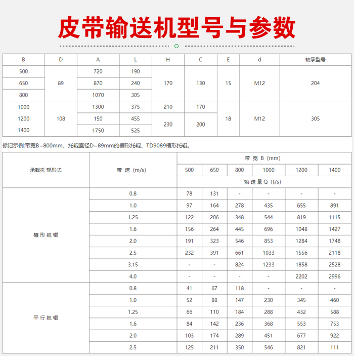 輸送量大小決定型號及電機(jī)功率的選擇,輸送量越大的皮帶輸送機(jī),應(yīng)選較高的帶速,型號也就越大。