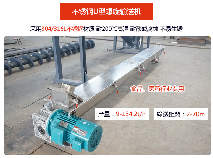 不銹鋼U型螺旋輸送機(jī)由于采用了304或316不銹鋼材質(zhì),耐磨、耐腐蝕效果非常好,耐高溫:可達(dá)200℃可以輸送200℃粉末、顆粒及小塊狀物料,不易生銹及不易污染物料:04或316不銹鋼材質(zhì)拋光處理,干凈衛(wèi)生,不會(huì)生銹,并且設(shè)備密封性好,可以避免對(duì)輸送物料及環(huán)境造成污染,所以一般在食品、醫(yī)藥等衛(wèi)生要求較為嚴(yán)格的行業(yè)中應(yīng)用較為廣泛,此外,還可用戶(hù)普通化工行業(yè),可抵抗弱酸、弱堿性物料的侵蝕。