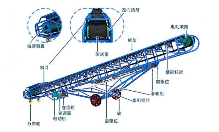 帶式輸送機(jī)主要由輸送帶、驅(qū)動裝置、滾筒、托輥、張緊裝置、清掃裝置等組成。輸送帶是輸送機(jī)的主體部件,用于承載物料并傳遞動力。驅(qū)動裝置通常包括電動機(jī)、減速器和聯(lián)軸器,提供動力驅(qū)動輸送帶運(yùn)行。滾筒用于支撐和傳遞輸送帶的運(yùn)動力,托輥支撐輸送帶并減少摩擦。張緊裝置用于調(diào)整輸送帶的張緊度,保持適當(dāng)?shù)膹埩?。清掃裝置用于清除輸送帶上的雜物,保持輸送帶清潔。這些組成部分協(xié)同工作,使帶式輸送機(jī)能夠高效、穩(wěn)定地完成物料的輸送任務(wù)。