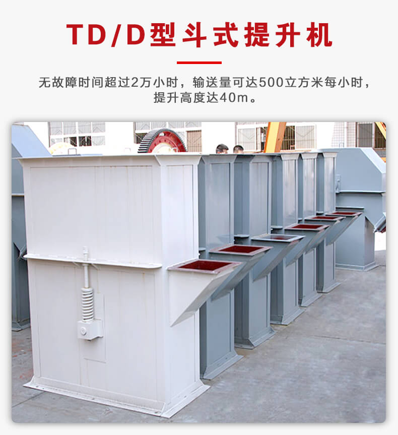 TD型斗式提升機(jī)由運(yùn)行部分料斗與牽引膠帶、帶有傳動(dòng)滾筒的 上部區(qū)段,帶有拉緊滾筒的下部區(qū)段,中間機(jī)殼,驅(qū)動(dòng)裝置,逆止制動(dòng)裝置等組成。無(wú)故障時(shí)間超過(guò)2萬(wàn)小時(shí),輸送量可達(dá)500m3/h,提升高度達(dá)40m。