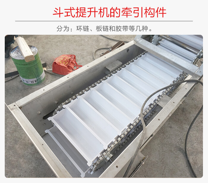 環(huán)鏈的結(jié)構(gòu)和制造比較簡(jiǎn)單,與料斗的連接也很牢固,輸送磨琢性大的物料時(shí),鏈條的磨損較小,但其自重較大。板鏈結(jié)構(gòu)比較牢固,自重較輕,適用于提升量大的提升機(jī),但鉸接接頭易被磨損,膠帶的結(jié)構(gòu)比較簡(jiǎn)單,但不適宜輸送磨琢性大的物料,普通膠帶物料溫度不超過(guò)60°C,夾鋼繩膠帶允許物料溫度達(dá)80°C,耐熱膠帶允許物料溫度達(dá)120°C,環(huán)鏈、板鏈輸送物料的溫度可達(dá)250°C。