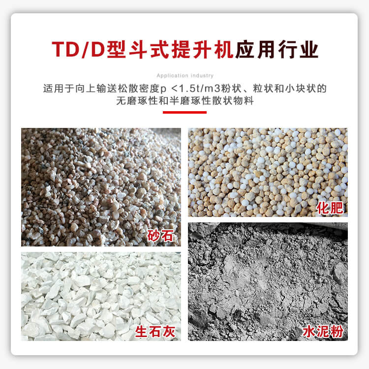 應(yīng)用行業(yè):TD型斗式提升機(jī)適用于向上輸送松散密度p <1.5t/m3粉狀、粒狀和小塊狀的無(wú)磨琢性和半磨琢性散狀物料 ,如煤、砂、焦末、水泥、碎礦石等。